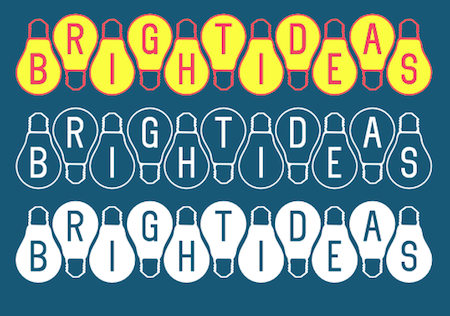 A few years ago I did a maze in a maze book that used lightbulbs for cells. This lightbulb pattern seemed appropriate for another typeface in which there are two sets of characters that alternate. I derived the letters on the bulbs from an early sans-serif typeface of mine, Myhota-Bold. A sample of the result, called BrightIdeas, is shown on the left. BrightIdeas has two family members, one that has outlined bulbs and one with solid bulbs. They can be used in layers for added color.