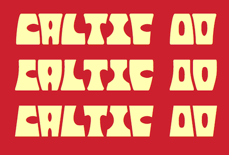 The Caltic family of six develops the theme of PoultySign with its letters based on trapezoids. The letters fit together with alternating up and down trapezoids and this is done with automatically with the contextual alternatives (calt) OpenType feature. Caltric is much bolder than PoultrySign and the vertical sides of four of the six fonts are curved. The result is similar to some of the poster lettering from the hippie era, but I can find nothing quite like it.