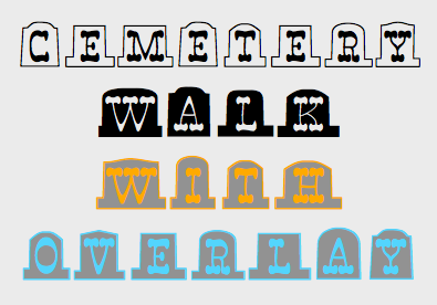 CemeteryWalk was designed for a cemetery-walking-tour event. It features upper-case letters (derived from the font Roundup) on tombstones. It has two styles, a regular style with black letters on white stones and a bold style with white letters on black stones. It is caps only, with the lower-case letters having different shapes for the tombstones but the same letters as in the upper case. The regular style can be overlaid on the bold version to create colored letters on colored grave markers.