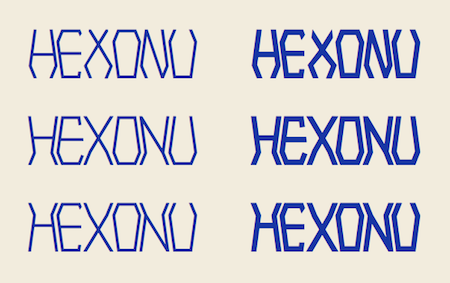Hexanu is another typeface family in which there are two sets of letters that can snuggle next to one another and the snuggling is made easy by the OpenType contextual alternatives (calt) feature. The foundation shape of the families a a coffin shape and the six styles have three different ways to complement this shape. The typeface is monospaced.