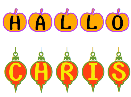 In addition, by using layers or by using several characters that are zero-width, the lettering can have three colors: the letters themselves, the outline of the pumpkin or ornament, and the color of the pumpkin or ornament. There are files in the gallery that explain how this can be done.