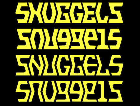 Snuggles began as a set of hexagons and hour-glass shapes that fit together. Letters were formed from these shapes with effort made to preserve as much as possible the original outlines. The result is two sets of letters that by themselves are awkward and misshapen and that only look good when mixed together. The OpenType contextual alternatives (calt) feature automatically alternates the sets in computer programs that support this feature.