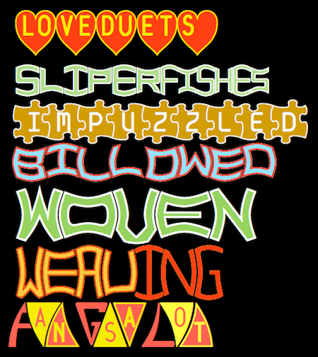 As 2022 began I continued trying to fill a lightly populated niche in typefaces: typefaces with alternating letter sets. LoveDuets alternates letters on the left half of a heart with letters on the right half. The family has two styles. SlipperyFishes has a wave both on top and bottom and the wave reflects rather than parallels. It comes in four styles. IMPuzzled puts letters on tessellating puzzle pieces. It has two styles. Billowed and Woven form letters from the template of distorted squares that tessellate. Billowed has four styles and Woven two. Weaving condenses Woven and loses the tessellation properties. Weaving has three styles. FangsALot is based on a tooth or fang shape and uses this shape in two very different ways. The family has nine styles.