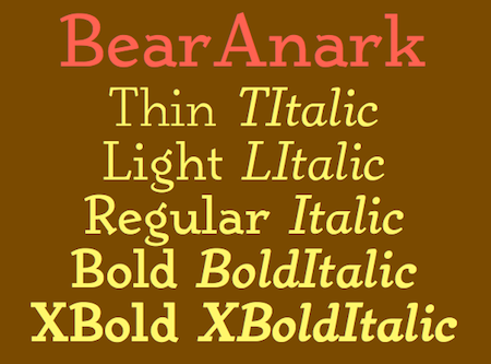 BearAnark is a decorative slab-serifed typeface that can be used for some text purposes. It has moderate contrast and comes in five weights, each with a true italic. The development of the family began with a blending of two other slab-serif faces, Anarckhie and BearButteT, and this origin is reflected in its name.