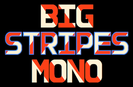 BigStripesMono is a family of four fonts designed to allow candy-cane lettering. Unlike other striped lettering, the stripes of this family are not obvious on a single letter. Rather two or more of the family members must be layered and arranged properly for the stripes to appear. It is another family from IngrimayneType designed to utilize the power of contextual alternatives.