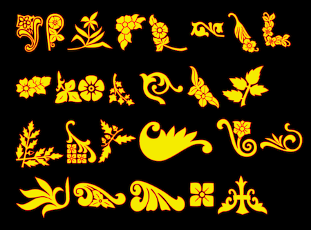 Ckornoments is a picture font of corner ornaments. It includes 23 designs each in four orientations so it can be used to decorate the four corners of a page or poster. Some of the designs also work well as section dividers. The Ckornoments family includes an outline style that was designed to be used in layers with the regular style, though each can be used alone. Ornaments that have flowers have be decomposed so that with layers they can be rendered as bicolored (or tricolored with the outline style) pictures.