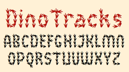 Over the years I have designed a number of letterbat fonts, fonts in which the letters are made up of objects such as feet, hands, safety pins, pipes, and bugs. In 2012 I tried to make one from dinosaur tracks but abandoned it because it just did not work.