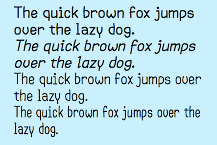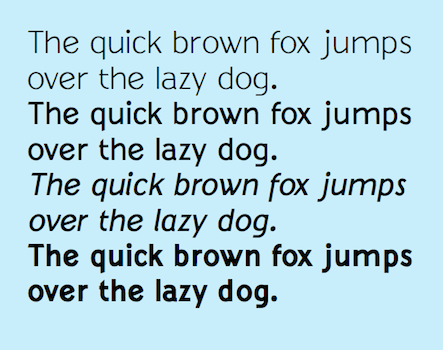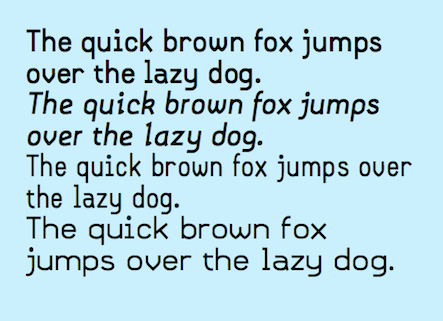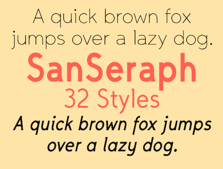 SanSeraph is a simple, clean, sans-serif font family that is highly legible and useful for both text and some display purposes. It is not meant to stand out but to blend in and let the reader focus on the meaning of the text rather than the look of the text. The family has 32 styles composed of three widths, two with five weights and the third with six, and each of these 16 has an italics style.)