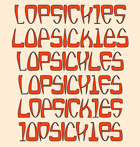Lopsickles is a strange family of twelve fonts, most of which use the OpenType feature of contextual alternatives to alternate characters. The letter shapes are based on a lopsided and distorted ellipse. The stroke varies, being heavier at the end that is wider. As a result, some letters are bottom heavy and some top heavy. The family has four sets of letters that are arranged to form six basic fonts, four of which are designed to alterate characters. Each of the six basic fonts has an inset style that can be overlaid to add color or to create the effect of outlined letters. The inset styles are not designed to be used alone but only in layers. Lopsickles joins several other alternating-characters families in the IngrimayneType library including Snuggels (May 2020), CloseTogether (December 2020), and Caltic (April 2020), but is visually very different from them.