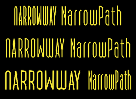 NarrowWay and Narrow Path are two condensed fonts. Each has three widths: ultracondensed, condensed, and regular, but even the regular is very condensed. Each width has three weights and each of these nine styles has an oblique version. NarrowWay does not have a lower-case but has mostly alternate forms where the lower cans should be. NarrowPath has a true lower case. They are the most condensed fonts in the Ingrimayne Type library.