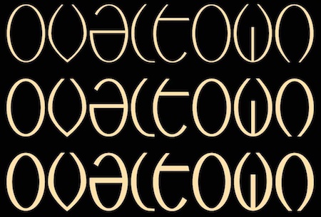 YinYangMessages contains two sets of letters, those on the upper-case keys that fit on the left side of a yin-yang symbol and those on the lower-case keys that fit on the left side of a yin-yang symbol. The OpenType contextual alternatives feature will alternate the sets automatically in any program that supports this feature. The family contains two fonts. In one the filled half is on the left and in the other the filled half is on the right. YinYangMessages is a fun and playful family that every once in a while may be the ideal typeface for some unusual situation.