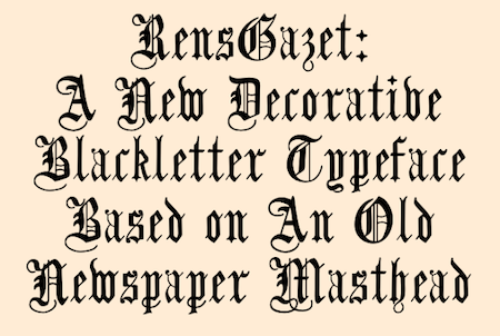 RensGazet is a decorative blackletter typeface with elaborate upper-case letters and condensed lower-case characters. It was inspired by the masthead of a short-lived weekly newspaper, The Rensselaer Gazette, which was published from 1857 until 1860. I could not find any existing digitized fonts that replicated this old typeface, so I decided to create an interpretation of it. I had samples of few letters in large point sizes and a number of others at a small point size, though these were blurry and not sharply defined. As a result, this typeface is undoubtedly considerably different from the original. Also, my spacing is much tighter than that in the source samples.