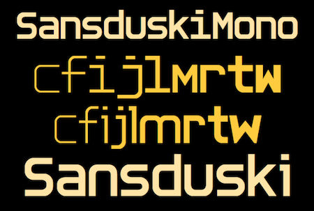 In designing BigStripesMono, I created a bold, sans-serif face that was all caps. I thought the face had possibilities as a decorative face without stripes, so I added a lower case and then created ten weights with matching obliques. I thought the face would also be nice with proportional letters, so I added another family of twenty faces. Both families are better suited for display than for text.
