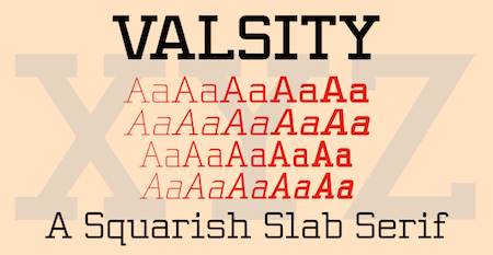 Valsity is a squarish slab-serif family with five weights and two widths, each with an italics for a total of twenty members. With negligible contrast, it is almost monoline. It is for decorative uses; it is too square and lacks the contrast to make it a good choice for extensive text. Valsity began with a blending of two other squarish slab-serifs, Valgal and Kwersity, and its name reflects that ancestry. From there it took on a life of its own, often diverging from its parents.