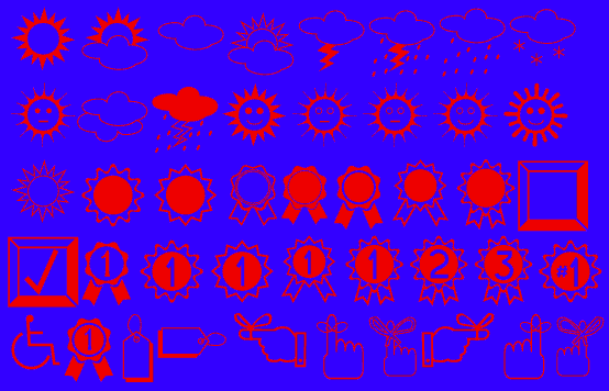 The first dingbat font that became widely used on computers was that of Zapf, introduced on the Macintosh sometime in the mid 1980s. When Microsoft finally got Windows to work, they introduced Wingdings. The selection of images above is an alternative rendition of many of the Wingding images. This typeface is called IngyDing. Below is IngyDingTwo. Not shown on these pages are other dingbat fonts I have done such as IngyDingThree and IngyDingLeftovers.