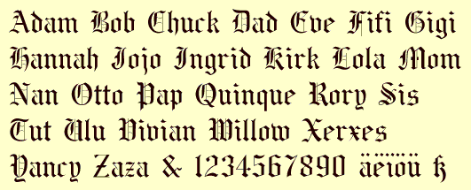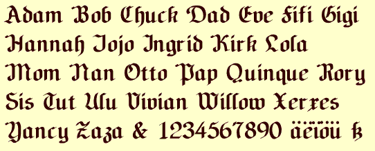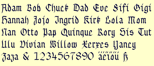 OldHaroldRee is a pun as well as a typeface. The lower-case letters were developed as part of a calligraphic Fraktur face, and the upper-case letters were then added to make it more of an Old-English font. It comes in two weights, plain and bold. This is the plain style.