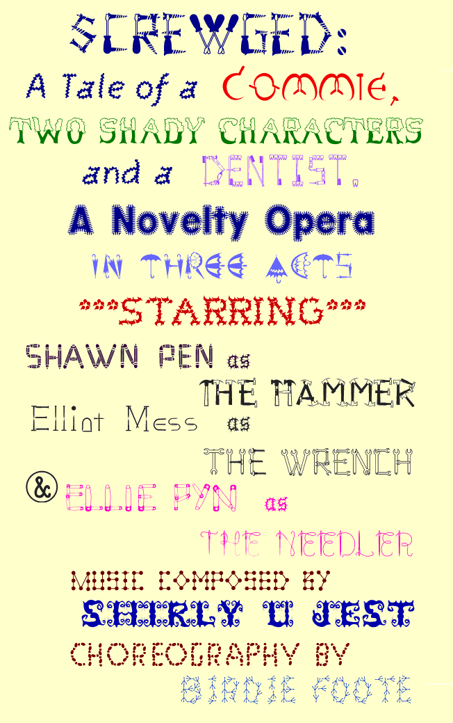 The fonts shown on the show bill above are, in order of appearance: Screwged, KnewFontJagged, RedLetter, ShadyCharacter, Teethee, KolkFrizzy, BumberShoot, WurstCactus, PencilFat, PhrackCack, Hammered, NailsNStaples, WrenchedLetters, TOCinRings, SafetyPinned, NeedALilly, Tinkerer, ShirlyUJest, PutMyFootDown, and ForTheBirds. KnewFontJagged, KolkFrizzy, WurstCactus, and PhrackCack are examples of fonts produced with a font distortion program, discussed on another page.