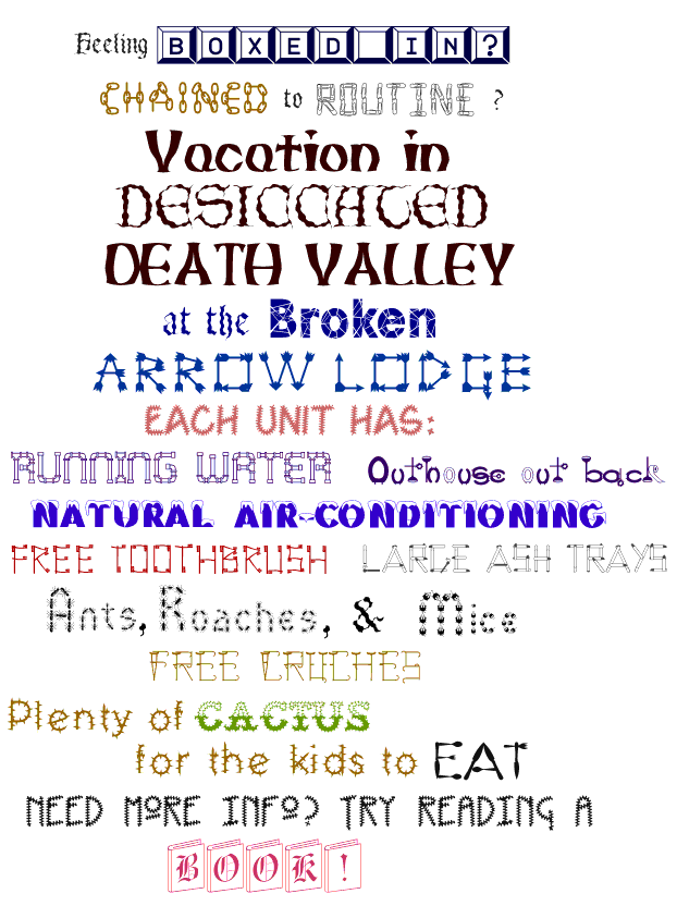 The fonts in this sample are, in order of appearance, LettergicalWave, JetJaneButton, ChainLetterOne, KlipJoint, UUeirdieWarp, KolkmanShatter, Zarrow, YahoschWormy, WaterWorksCaps, WaterCloset, Brrrrr, Toothbrush, CoughingNails, AntsyPantsy, BuggyFont, MousyFont, CrippledFont, AndrewAndyKactus, CourtJestureFrizzy, Dinner, KneeblsRuffled, and NewLibrary. An earlier version of Zarrow was released as shareware, but none of the others have been. If they are floating out there in cyberspace, they are pirated copies and should be avoided by moral persons.