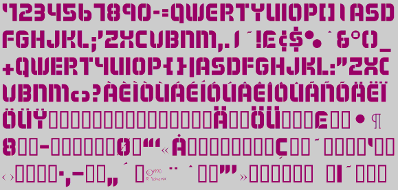 Modsten is a stencil typeface that does not come from a previous font. The style is supposed to be a modernistic looking style, and hence the name--ModernStencil shortened to Modsten. All the letters are upper-case, but some of those on the lower-case keys differ from those on the upper-case keys. The bold version was created first, with the plain version something of an afterthought.